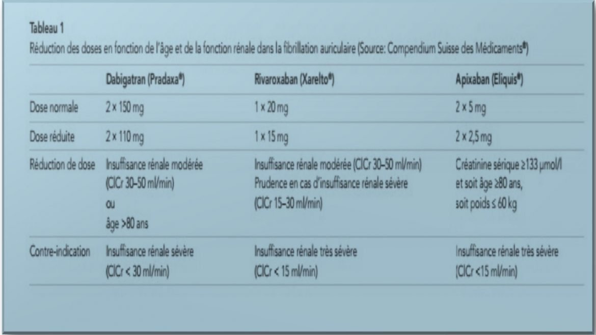 Traitement Les nouveaux anticoagulants oraux (NACO) en gériatrie by jamel MOUHLI 28 août 2015 written by jamel MOUHLI 28 août 2015 0 comments 9 minutes read Bookmark 465 {AR-youtube width= »100% »}watch?v=-Ey3ABE58T0{/AR-youtube} Résumé – Les NACO sont actuellement approuvés dans la prévention des AVC et des embolies systémiques en présence de fibrillation auriculaire non-valvulaire, le rivaroxaban disposant en plus de l’indication du traitement et de la prévention secondaire des thromboses veineuses profondes et des embolies pulmonaires. Les NACO ne couvrent ainsi pas toutes les indications des anticoagulants oraux. – En l’état actuel de nos connaissances, des personnes âgées de plus de 75 ans ne souffrant d’aucune comorbidité significative et dont la fonction rénale est conservée peuvent être anticoagulés de manière efficace et sûre avec les NACO. – Les facteurs de risque hémorragique sont l’âge avancé, l’insuffisance rénale et un faible poids de corps. – La fonction rénale des patients sous NACO doit être réguliè- rement contrôlée, en particulier en cas de baisse de l’état gé- néral. La formule d’estimation selon Cockcroft et Gault est surtout appropriée pour l’évaluation de la fonction rénale. – Tant qu’il ne sera pas possible de procéder à un monitoring fiable des effets sur la coagulation, les patients présentant une insuffisance rénale sévère ou dont la fonction rénale est fluctuante – une situation très fréquente en gériatrie – ne seront pas des candidats à une anticoagulation par NACO. Références 1 Agarwal S, Hachamovitch R, Menon V. Current trial-associated outcomes with warfarin in prevention of stroke in patients with nonvalvular atrial fibrillation: a meta-analysis. Arch Intern Med. 2012;172(8):623–31; discussion 31–3. 2 Eikelboom JW, Connolly SJ, Brueckmann M, Granger CB, Kappetein AP, Mack MJ, et al. Dabigatran versus warfarin in patients with mechanical heart valves. NEJM. 2013;369(13):1206–14. 3 Ruff CT, Giugliano RP, Braunwald E, Hoffman EB, Deenadayalu N, Ezekowitz MD, et al. Comparison of the efficacy and safety of new oral anticoagulants with warfarin in patients with atrial fibrillation: a meta-analysis of randomised trials. Lancet. 2014;383(9921):955–62. 4 Prins MH, Lensing AW, Bauersachs R, van Bellen B, Bounameaux H, Brighton TA, et al. Oral rivaroxaban versus standard therapy for the treatment of symptomatic venous thromboembolism: a pooled analysis of the EINSTEIN-DVT and PE randomized studies. Thrombosis J. 2013;11(1):21. 5 Sardar P, Chatterjee S, Chaudhari S, Lip GY. New oral anticoagulants in elderly adults: evidence from a meta-analysis of randomized trials. J Am Geriatrics Soc. 2014;62(5):857–64. 6 Harper P, Young L, Merriman E. Bleeding risk with dabigatran in the frail elderly. [Letter] NEJM. 2012366(9):864–6. 7 Hellden A, Odar-Cederlof I, Nilsson G, Sjoviker S, Soderstrom A, Euler M, et al. Renal function estimations and dose recommendations for dabigatran, gabapentin and valaciclovir: a data simulation study focused on the elderly. BMJ Open. 2013;3(4). 8 Gage BF, Birman-Deych E, Kerzner R, Radford MJ, Nilasena DS, Rich MW. Incidence of intracranial hemorrhage in patients with atrial fibrillation who are prone to fall. Am J Med. 2005;118(6):612–7. 9 Heidbuchel H, Verhamme P, Alings M, Antz M, Hacke W, Oldgren J, et al. European Heart Rhythm Association Practical Guide on the use of new oral anticoagulants in patients with non-valvular atrial fibrillation. Europace. 2013;15(5):625–51. Correspondance: Dr Matthias Frank Innere Medizin Schwerpunkt Geriatrie stv. Chefarzt Universitäres Zentrum für Altersmedizin und Rehabilitation Felix Platter Spital Burgfelderstrasse 101 Postfach 4012 Basel matthias.frank[at]fps-basel.ch Une contribution du congrès CMPR 2014 avec la collaboration de la Dresse Annemarie Martin Vogt Les NACO constituent un progrès thérapeutique indé- niable et simplifient le traitement anticoagulant pour de nombreux patients. Les antagonistes de la vitamine K représentent depuis les années 1960 le standard dans le traitement des maladies thromboemboliques et pourtant ils restent associés, dans la pratique clinique, à toute une série de problèmes. L’entrée en action des antivitamine K est lente, leur fenêtre thérapeutique est étroite, leurs interactions médicamenteuses sont nombreuses et leur action est soumise à des fluctuations en fonction des apports alimentaires en vitamine K. La réponse individuelle est imprévisible et requiert un monitoring. Même dans des conditions d’essais cliniques, les valeurs d’INR mesurées ne se situent d’ailleurs dans la marge thérapeutique que dans 70% des cas à peine [1]. Les nouvelles molécules arrivées sur le marché ces dernières années, autrement dit l’inhibiteur direct de la thrombine dabigatran (Pradaxa®) et les antagonistes du facteur Xa rivaroxaban (Xarelto®) et apixaban (Eliquis®), commencent à disputer sérieusement la place aux Marcoumar® & co. Les trois substances citées ont en commun le fait d’offrir une anticoagulation thérapeutique moyennant une ou deux prises orales par jour de doses fixes, qui ne nécessitent plus de contrôles réguliers de la coagulation. Indications Ces trois anticoagulants sont indiqués dans la prévention des accidents vasculaires cérébraux et des embolies systémiques chez les patients adultes souffrant de fibrillation auriculaire d’origine non-valvulaire. Remarque importante : les patients avec sté- nose mitrale et fibrillation auriculaire, mais surtout les porteurs de valves mécaniques, doivent toujours être traités obligatoirement par les antagonistes de la vitamine K [2]. Seul le rivaroxaban est indiqué en plus dans le traitement et la prévention des récidives de thromboses veineuses profondes et d’embolies pulmonaires. Le présent articule ne traitera pas de l’indication de la « prévention des thromboses ap